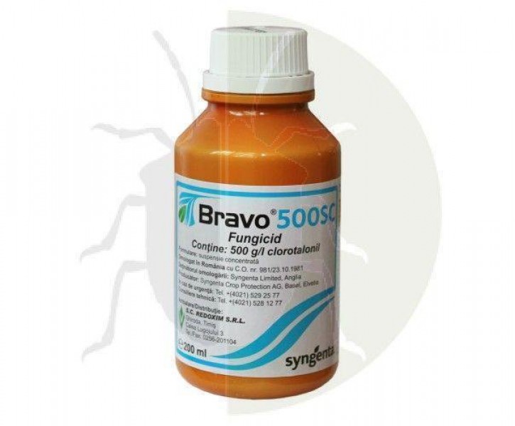 Caracteristici: Bravo 500 SC este fungicid de contact cu spectru larg de combatere a bolilor. Bravo 500 SC beneficiaza de o formulare superioara ce are la baza o tehnologie unica dezvoltata de Syngenta. Aplicat la debutul perioadei de risc de declansare a procesului de imbolnavire, Bravo 500 SC previne infestarea cu agenti patogeni si dezvoltarea acestora. Bravo 500 SC prezinta risc scazut de aparitie a rezistentei bolilor.