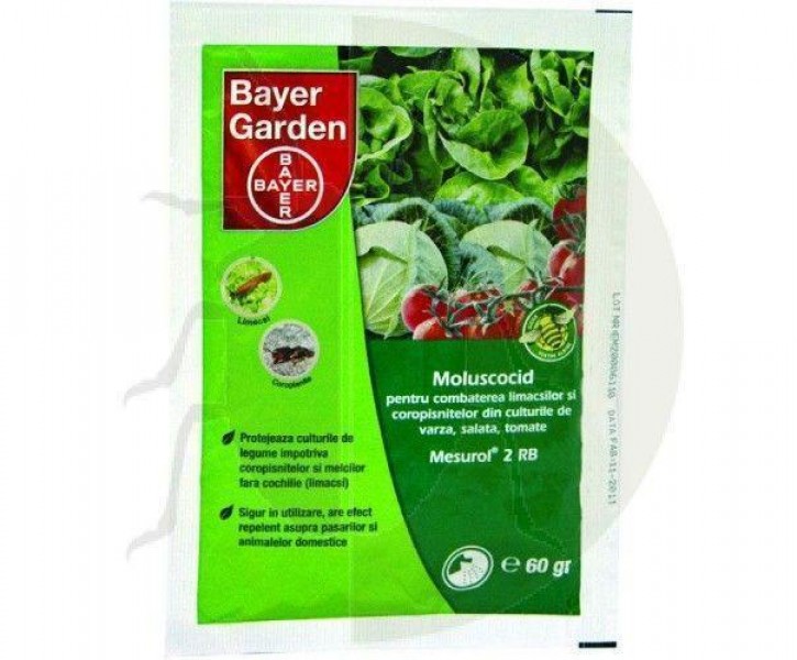 Mesurol® 2RB are un efect atractant asupra limacsilor si coropisnitelor. Acesti daunatori sunt omorati la scurt timp dupa ingestia granulei sau a unei parti din granula. Mesurol® 2 RB are efect rapid si de lunga durata, protejand legumele impotriva daunelor cantitative si calitative produse de limacsi si coropisnite. Actiunea sa nu este influentata de precipitatii si temperaturi ridicate. Produsul are un efect repelent foarte bun asupra pasarilor si animalelor domestice.